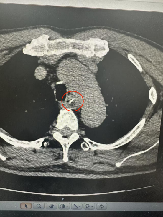 CT扫描显示,一根约25毫米长的鱼骨卡在食管中部,两端靠近食管壁外缘和主动脉弓内侧。主动脉是人体最大的动脉,鱼骨处于非常危险的位置。